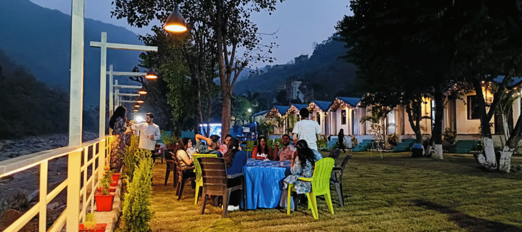 A luxury riverside property surrounded by mountains, known for its serene ambience, spacious cottages, and festive New Year celebration package in rishikesh